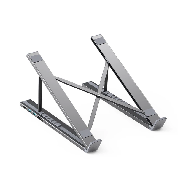 Podstawka pod laptopa Choetech HUB-M48 pozwala na ustawienie laptopa pod odpowiednim kątem. W dolnej części podstawki znajdują się dwa gniazda USB-A o przepustowości do 5 Gb/s, gniazdo HDMI umożliwiające wyświetlanie obrazu w wysokiej rozdzielczości 4K 30 Hz oraz trzy gniazda USB-C. Podstawka pod laptopa Choetech HUB-M48 posiada również wejścia na kartę SD i TF.